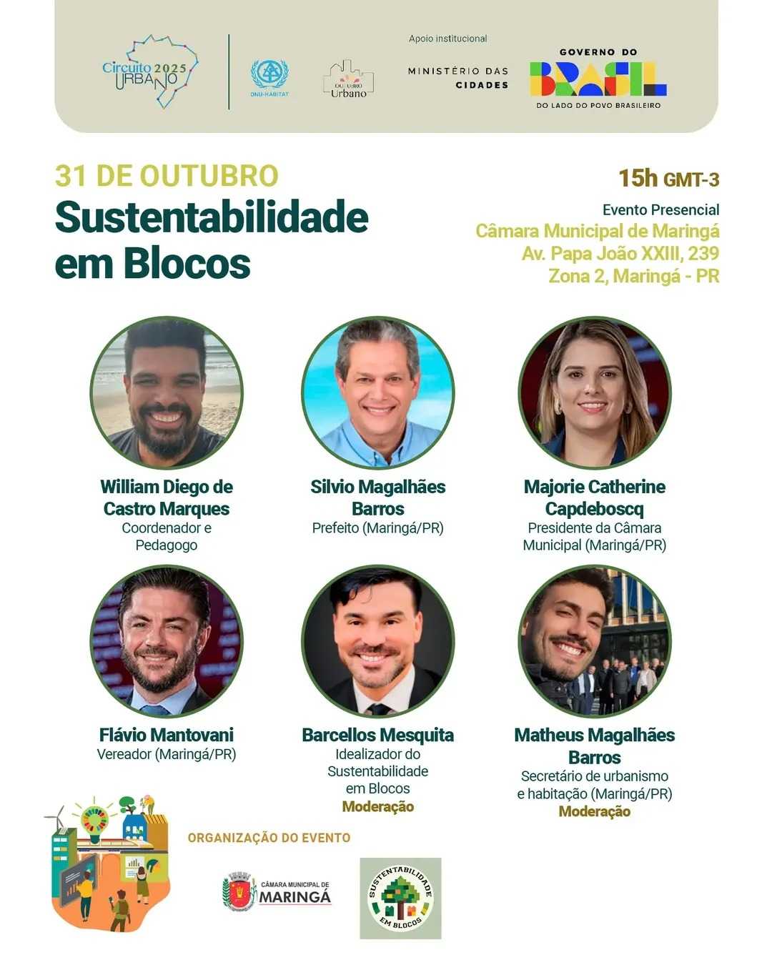 Nesta sexta-feira (31), às 15 horas, acontece na Câmara de Maringá, a apresentação oficial do projeto Sustentabilidade em Blocos (SEBS)-Transformando cidades, bloco por bloco, aprovado pela ONU-Habitat como parte do Circuito Urbano 2025.