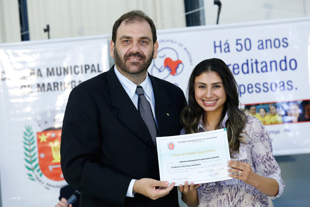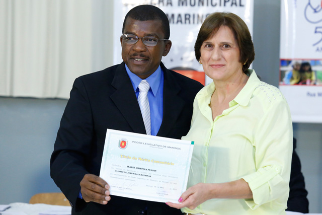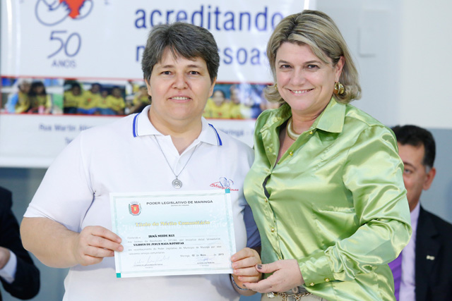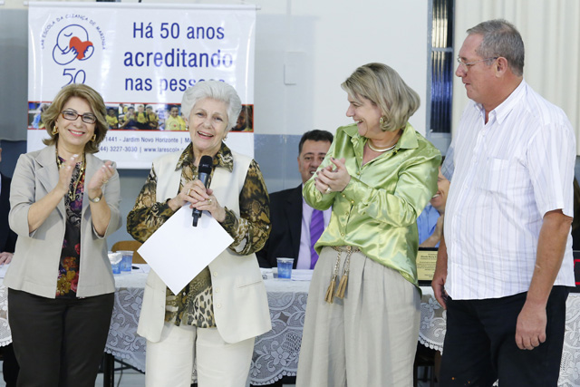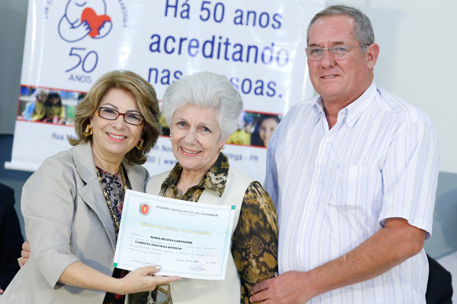 Irmã Elizete recebeu da Câmara o brasão do Município em homenagem ao aniversário da entidade. O título de mérito comunitário foi entregue a ex-presidente do Lar, Maria Helena Cantadori; aos voluntários José Pereira Sapata e Isabel Cristina Puppin representando a todos que contribuem com o trabalho de atendimento às crianças e adolescentes.