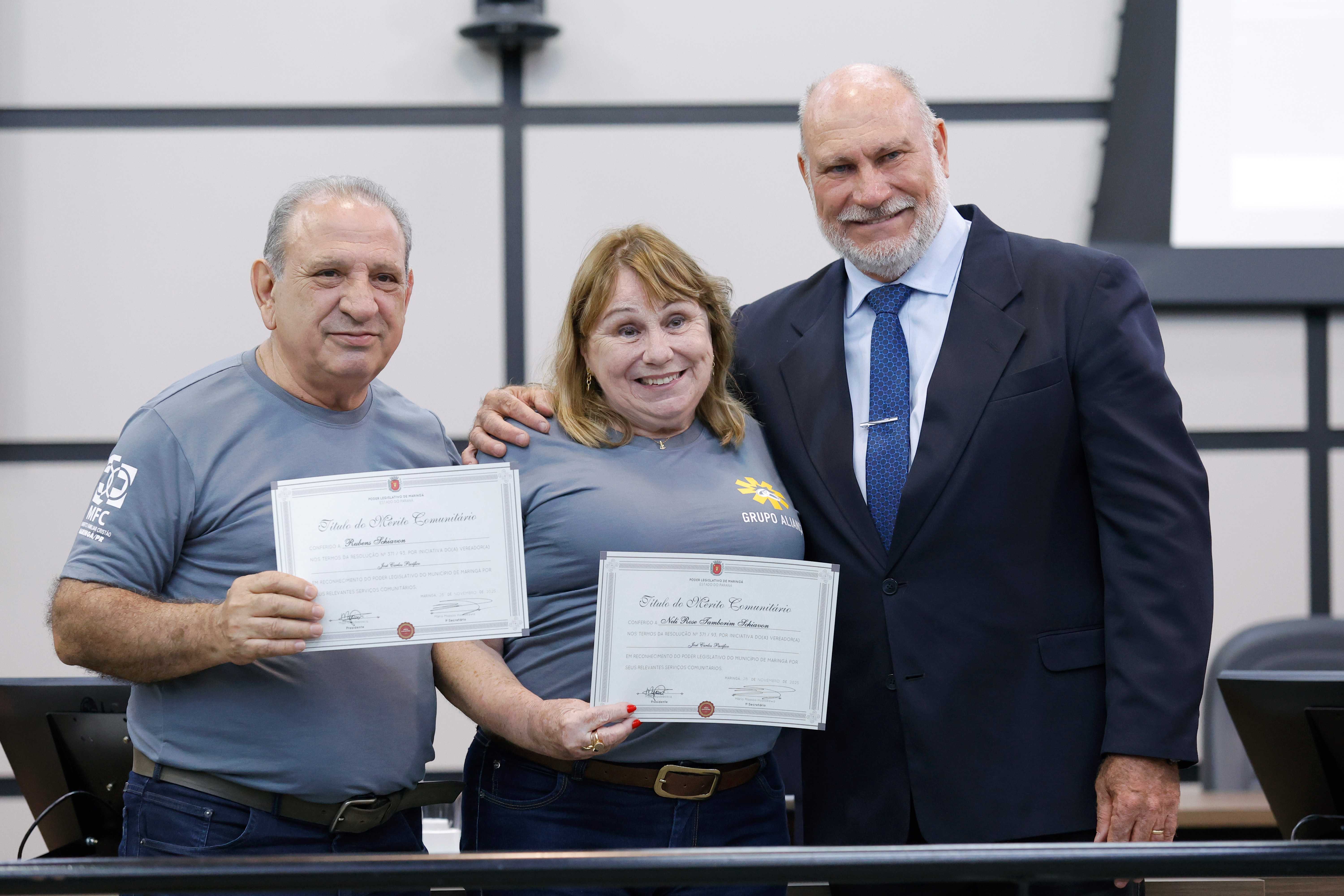 Os fundadores do Grupo Aliança, Rubens Schiavon e Néli Rose Tamborim Schiavon, receberam destaque especial. O casal relembrou momentos importantes da criação do grupo e agradeceu o reconhecimento do Legislativo. Eles enfatizaram que o nome “Aliança” simboliza união e continuidade, refletindo o compromisso das famílias que construíram essa história ao longo de 50 anos.