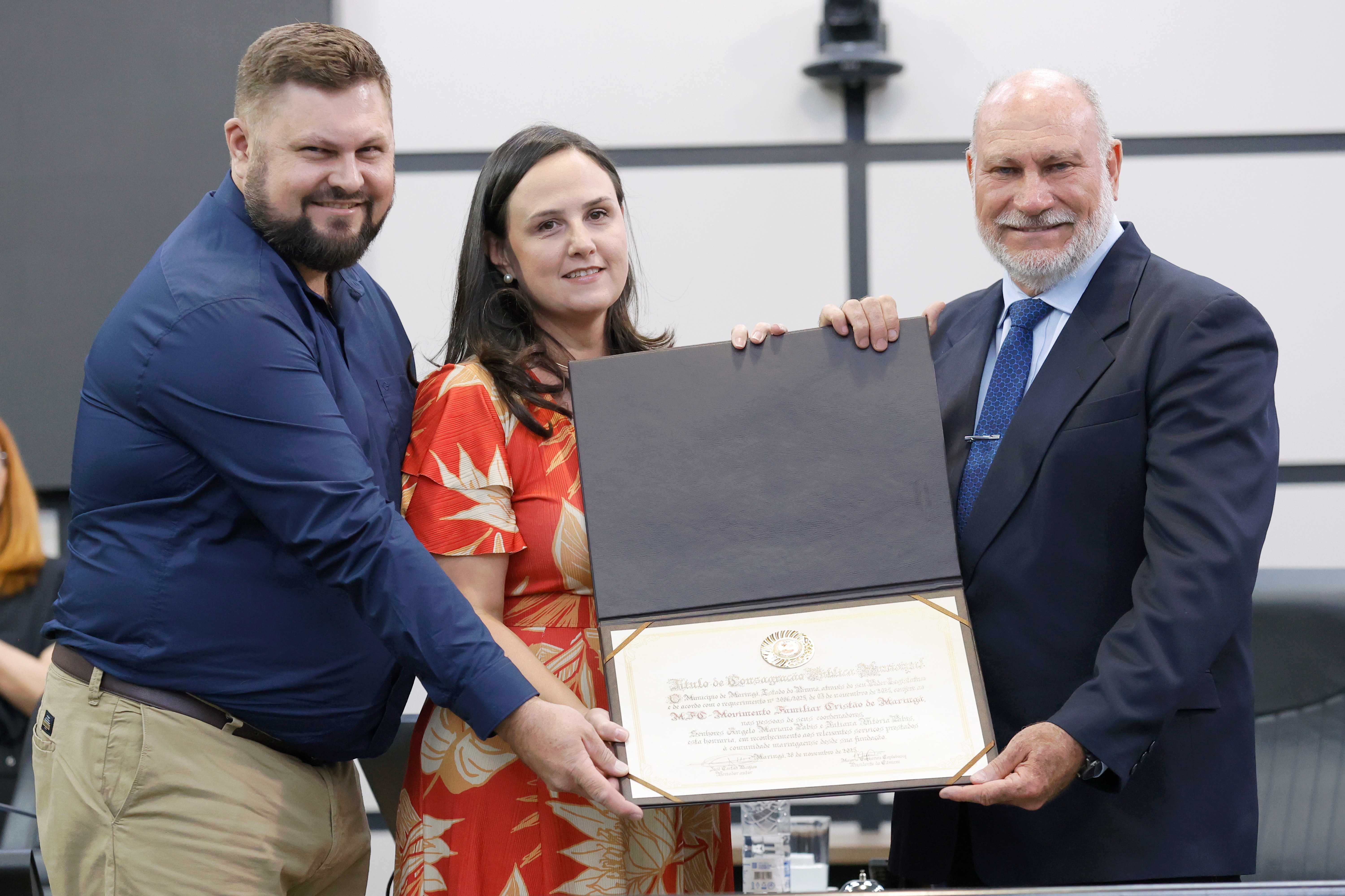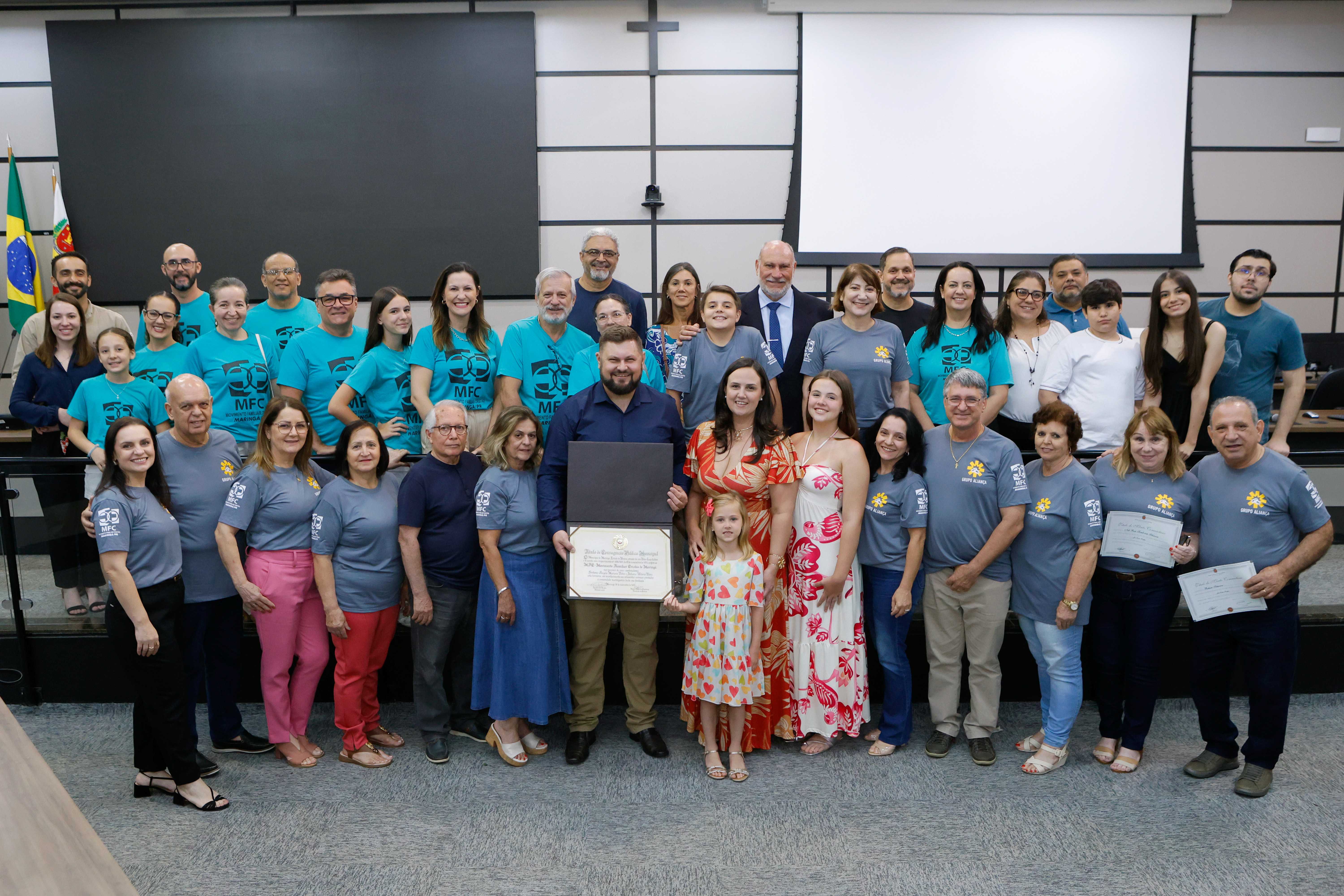 A Câmara de Maringá realizou, na noite desta sexta-feira (28), uma sessão solene dedicada ao reconhecimento do trabalho do Movimento Familiar Cristão (MFC) e à celebração dos 50 anos do Grupo Aliança, um dos mais tradicionais grupos base do movimento na cidade. A cerimônia, conduzida pela presidente do Legislativo, vereadora Majô, reuniu vereadores, lideranças religiosas, integrantes do MFC e familiares.
