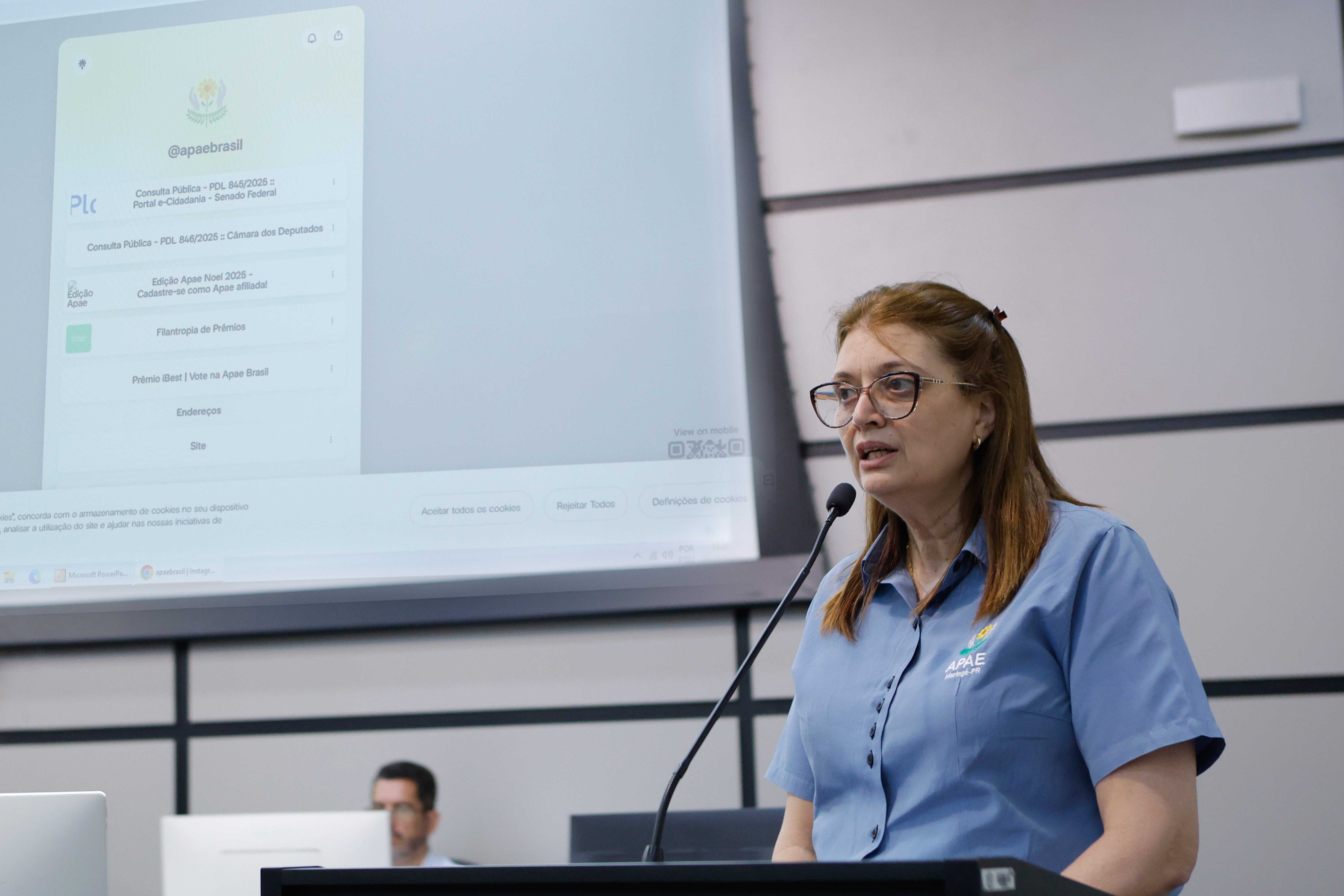Sra. Cacilda Veronezi Jaloto Santos, Diretora Pedagógica da APAE de Maringá, falou sobre a preocupação da instituição frente ao Decreto Federal nº 12686/2025.